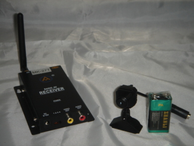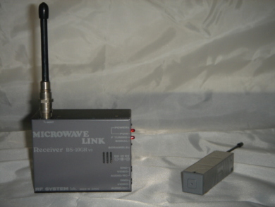 左側にあるのがこのカメラの専用受信機で、テレビモニターにつなげて映像を見ます。1.2GHz帯同様、決まった周波数の割り当てがありませんので、専用受信機以外の受信機で鮮明な映像を見るのは非常に難しいです。