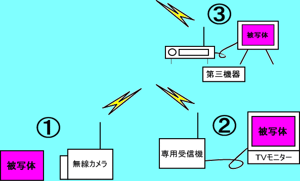 無線カメラの映像は、専用受信機でなければ受信できないとされてきました。しかし、周波数を自由自在に変えられる無線受信機が映像受信機能を持ち、本来カメラと専用受信機の二者間やり取りだったものに「第三機器」として入り込めるようになりました(B)。